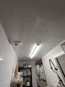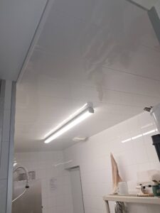 Pour ce projet, nous avons réalisé un plafond en PVC, idéal pour un entretien facile et une hygiène impeccable.